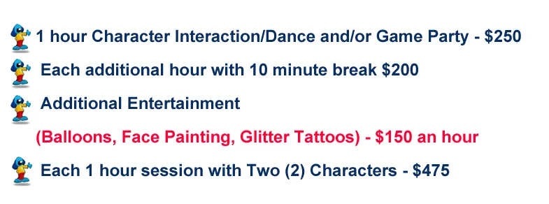 Each costume character comes with a party host, stereo system, and music. Each character is booked by the hour. Costume Characters are performed by a professional entertainer. We do not rent out the costumes for personal use.