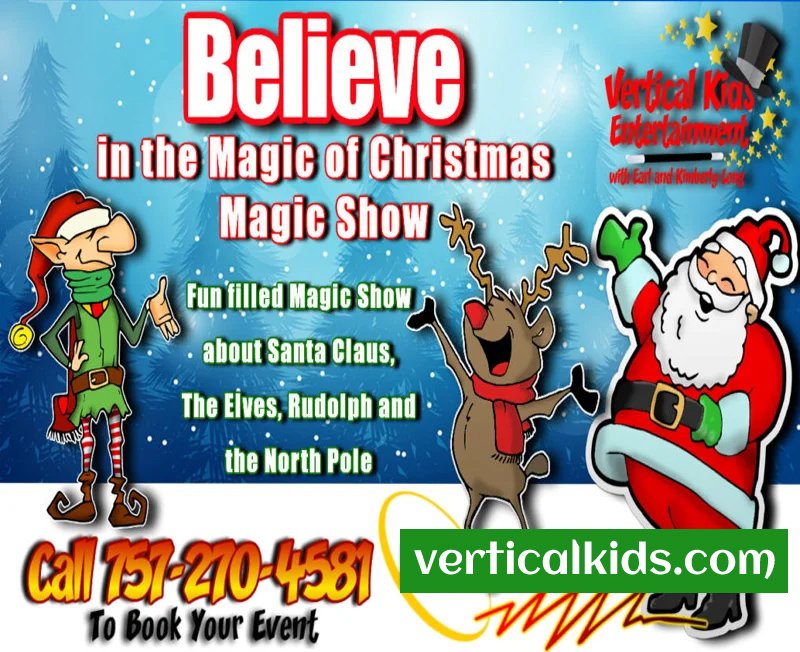 This is a 30 min. show that features a delightful use of colorful silks, tubes, boxes, ropes, chains, lights, puppets and Christmas music to incorporate fun magical stories about Santa Clause, the North Pole, Rudolph The Red Nosed Reindeer, Candy Canes and Santa’s Elves. Kids will see items appear and disappear.