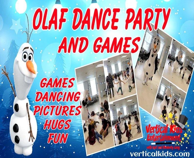You can have a Frozen Olaf Snowman visit your center or school or event this Winter season(or anytime throughout the year). He will give hugs, have a dance party, play games, kids will make snow. We will have a performance host with Olaf that will lead the fun party and dance games.